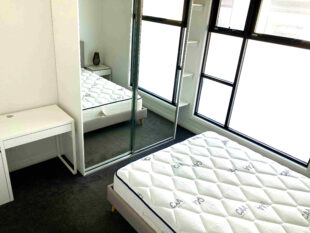 家具はシングルベッドと勉強机が付いた部屋と、家具がない部屋があります。どちらのベッドルームも壁一面がクローゼットになっているので収納には困らないかと思います。