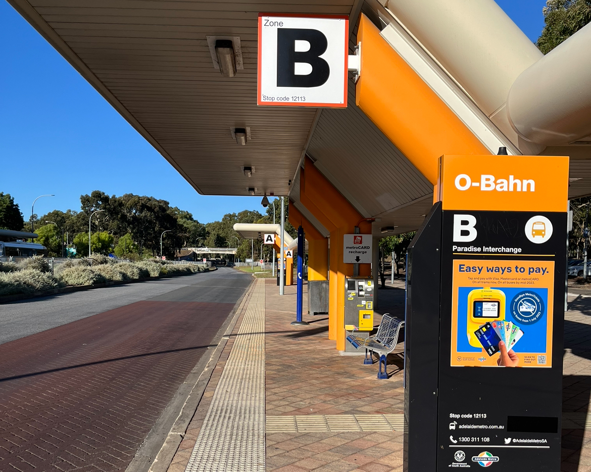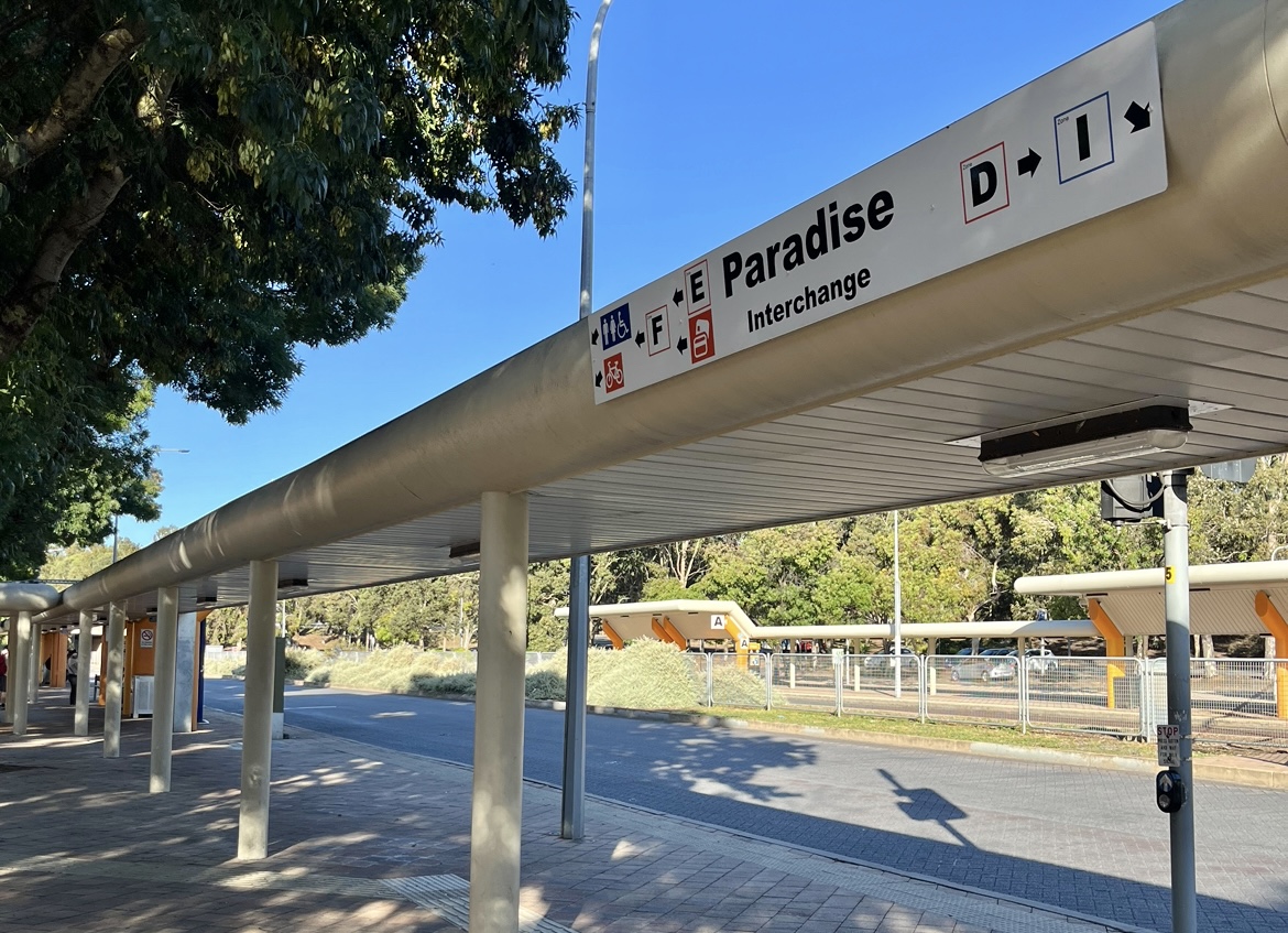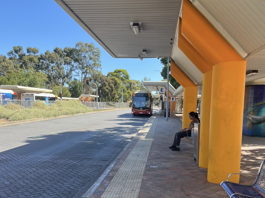 アデレード市街まで、バスで2駅10分(バスは5~10分毎)。