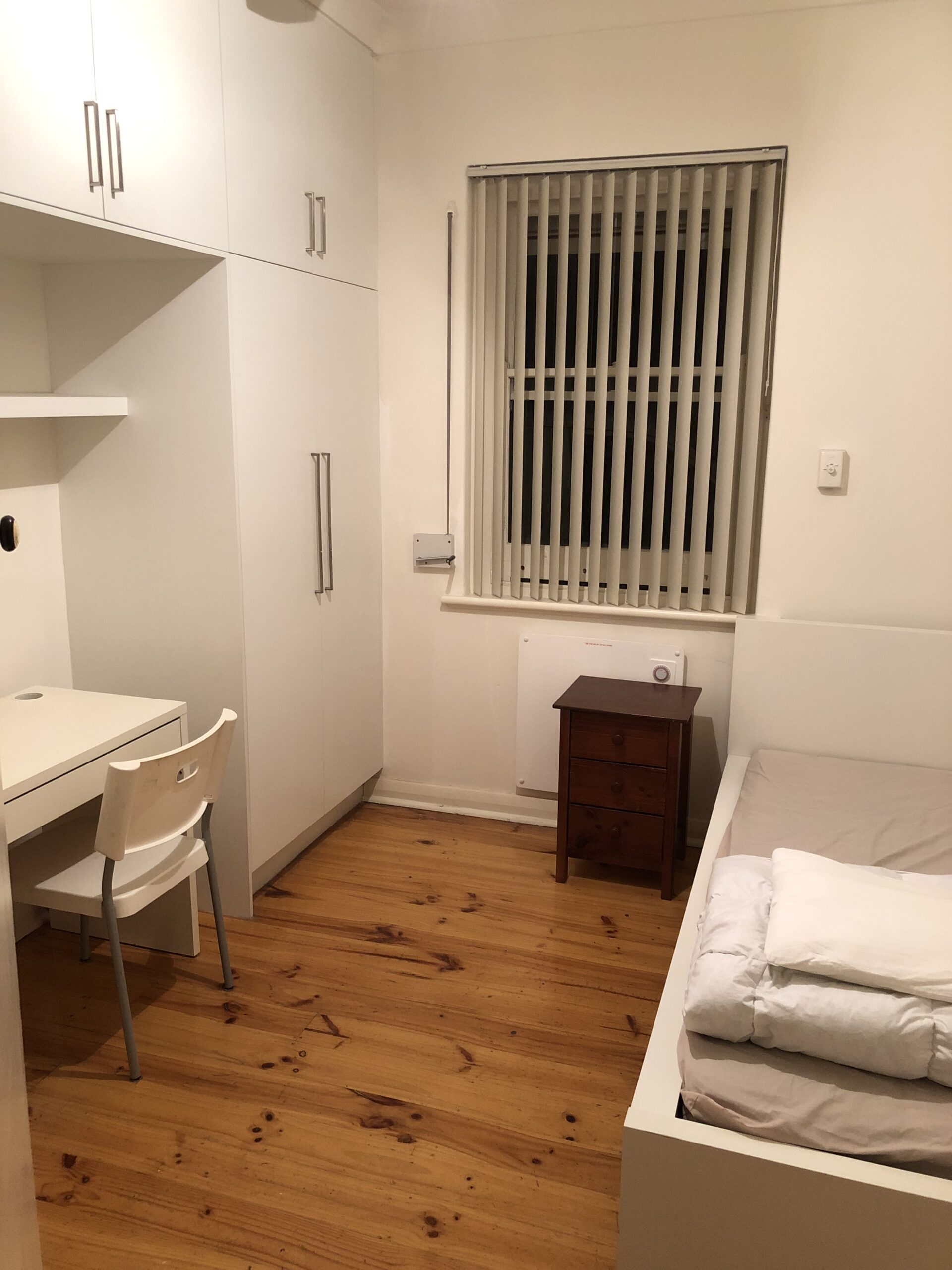 家具はシングルベッドと勉強机が付いた部屋と、家具がない部屋があります。どちらのベッドルームも壁一面がクローゼットになっているので収納には困らないかと思います。