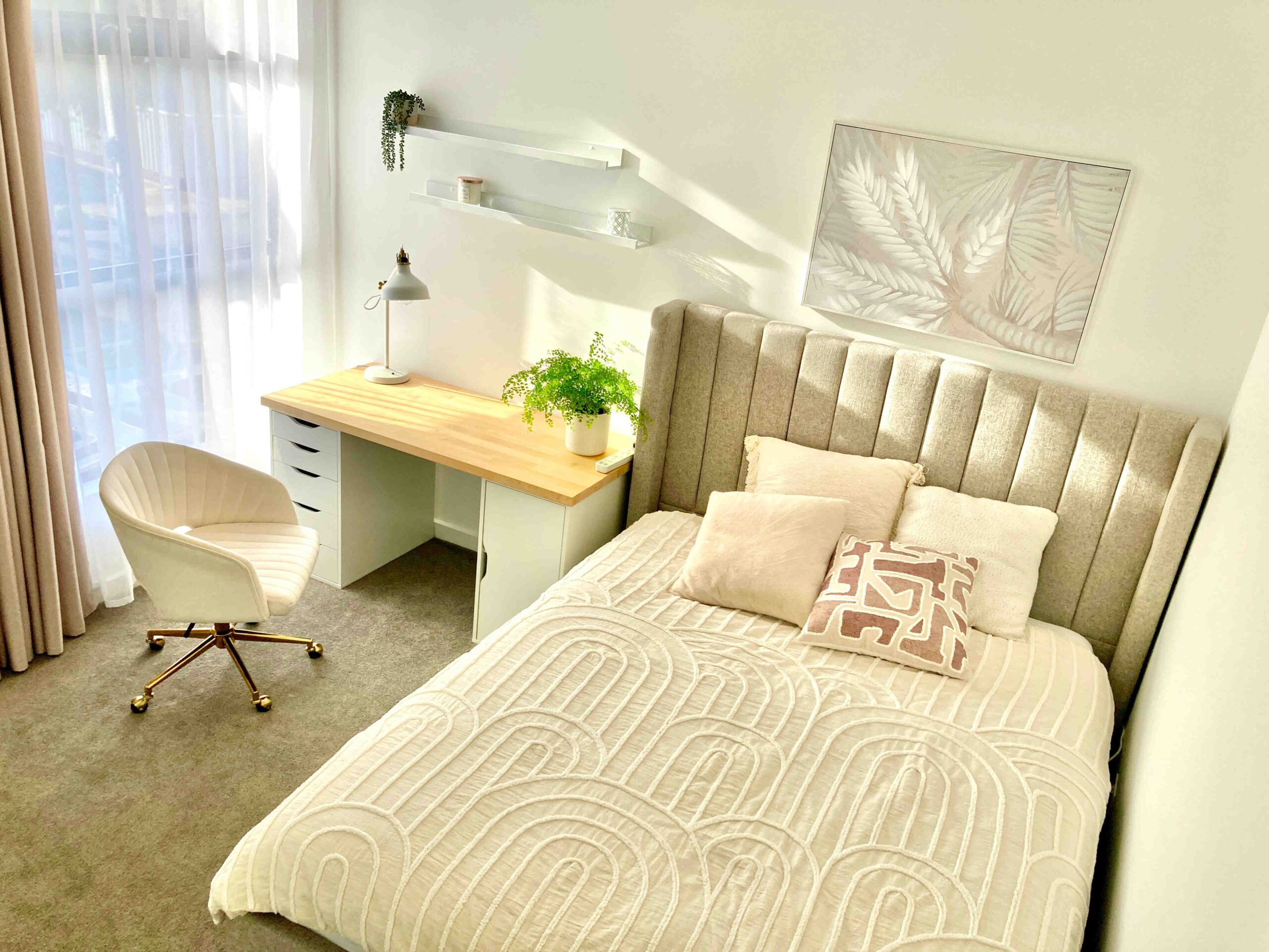 • オウンルーム(トイレとシャワーはもう1人の日本人女の子とシェア)、クイーンサイズベッド、デスク、チェア、クローゼット