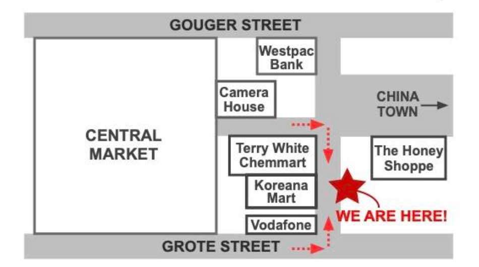 これまでの場所からは歩いて2分ほど。セントラルマーケットをチャイナタウン方面に進み、テリーホワイト薬局の角を右折してください。コリアナマートの向かいにあります。
