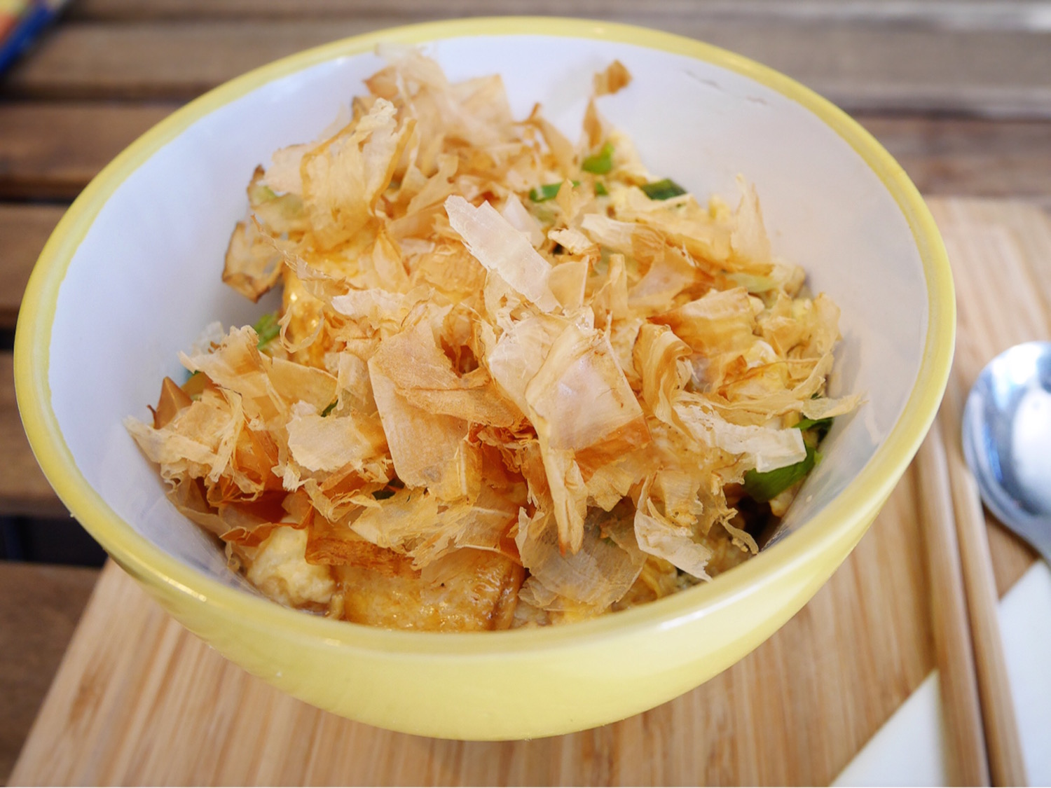 そしてこちらも根強い人気のTOFU($9.0)。ふわトロ卵でとじた揚げ出し豆腐の上で踊るかつお節が幸せな気持ちにしてくれる 。お口にジュワ〜っとひろがる出汁が何とも美味 。米にはコシヒカリが使われ美味しさをいっそう引き立てている。味もボリュームも満点!