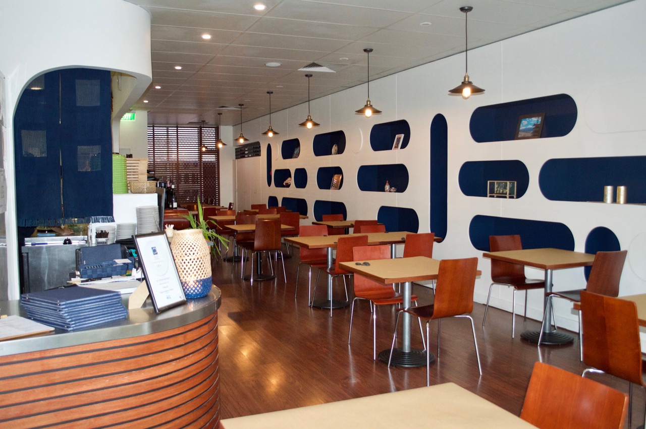 藍色と白の爽やかな印象の看板が目印だ。店内でも目を引く藍色と白のカラーは、徳島県出身のオーナーが地元の特産品である藍染をモチーフにしたそう。